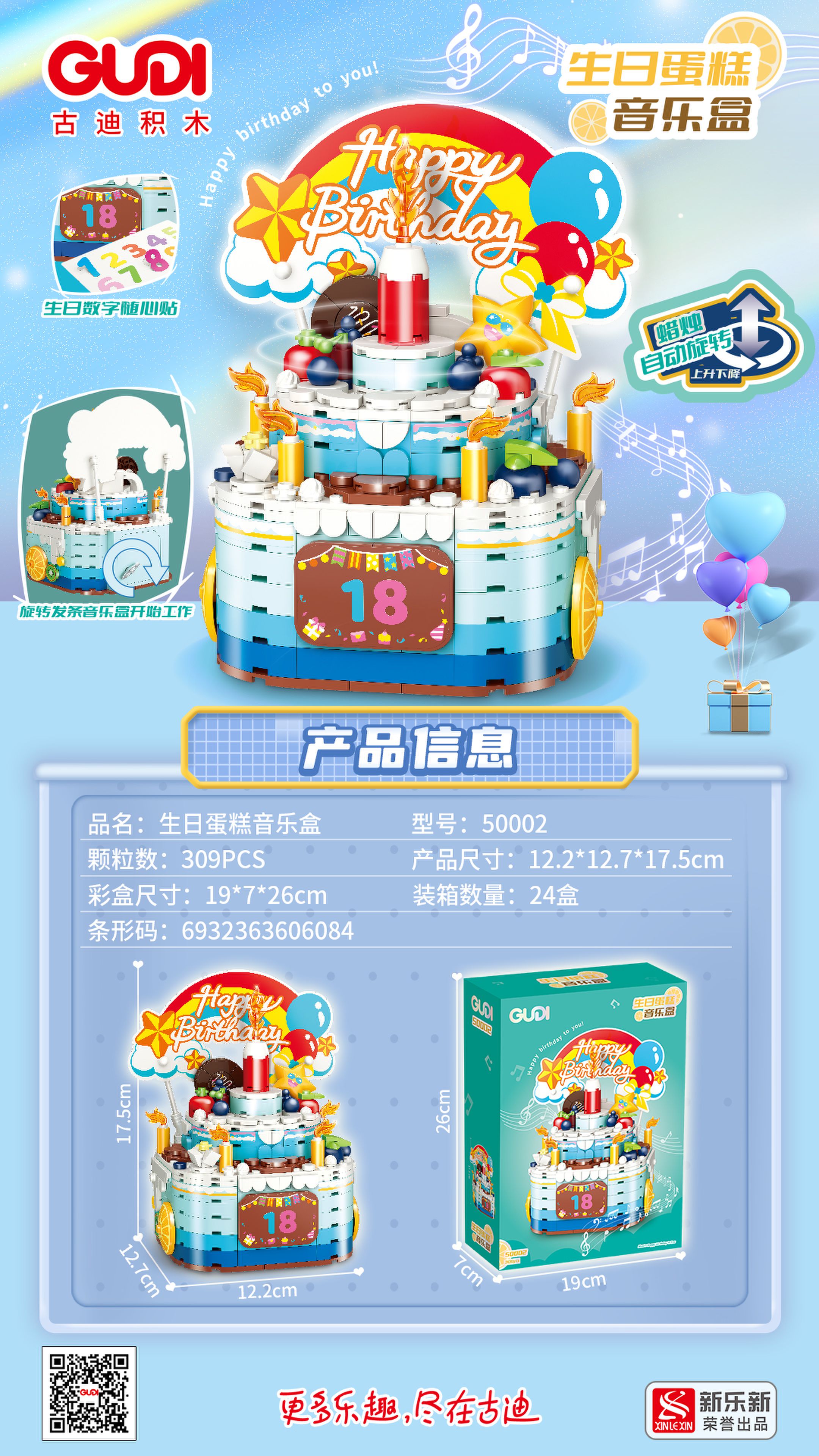 • 描述:扭動(dòng)產(chǎn)品背后的發(fā)條件,中間的紅色蠟燭會(huì)慢慢上下旋動(dòng),并發(fā)出音樂(lè):《祝你生日快樂(lè)》。產(chǎn)品搭配0-9的數(shù)字貼紙,可隨意粘貼你想要的生日數(shù)字。